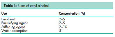 Cetyl alcohol is widely used in cosmetics and pharmaceutical formulations such as suppositories, modified-release solid dosage forms, emulsions, lotions, creams, and ointments. In suppositories cetyl alcohol is used to raise the melting point of the base, and in modified-release dosage forms it may be used to form a permeable barrier coating. In lotions, creams, and ointments cetyl alcohol is used because of its emollient, water-absorptive, and emulsifying properties. It enhances stability, improves texture, and increases consistency. The emollient properties are due to absorption and retention of cetyl alcohol in the epidermis, where it lubricates and softens the skin while imparting a characteristic ‘velvety’ texture. Cetyl alcohol is also used for its water absorption properties in water-in-oil emulsions. For example, a mixture of petrolatum and cetyl alcohol (19 : 1) will absorb 40–50% of its weight of water. Cetyl alcohol acts as a weak emulsifier of the water-in-oil type, thus allowing a reduction of the quantity of other emulsifying agents used in a formulation. Cetyl alcohol has also been reported to increase the consistency of water-in-oil emulsions. In oil-in-water emulsions, cetyl alcohol is reported to improve stability by combining with the water-soluble emulsifying agent. The combined mixed emulsifier produces a close packed, monomolecular barrier at the oil–water interface which forms a mechanical barrier against droplet coalescence. In semisolid emulsions, excess cetyl alcohol combines with the aqueous emulsifier solution to form a viscoelastic continuous phase that imparts semisolid properties to the emulsion and also prevents droplet coalescence. Therefore, cetyl alcohol is sometimes referred to as a ‘consistency improver’ or a ‘bodying agent’, although it may be necessary to mix cetyl alcohol with a hydrophilic emulsifier to impart this property. It should be noted that pure or pharmacopeial grades of cetyl alcohol may not form stable semisolid emulsions and may not show the same physical properties as grades of cetyl alcohol that contain significant amounts of other similar alcohols. See Section 4. See Table I.