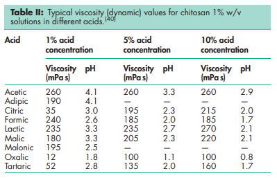 Chitosan is a cationic polyamine with a high charge density at pH < 6.5, and so adheres to negatively charged surfaces and chelates metal ions. It is a linear polyelectrolyte with reactive hydroxyl and amino groups (available for chemical reaction and salt formation).(7) The properties of chitosan relate to its polyelectrolyte and polymeric carbohydrate character. The presence of a number of amino groups allows chitosan to react chemically with anionic systems, which results in alteration of physicochemical characteristics of such combinations. The nitrogen in chitosan is mostly in the form of primary aliphatic amino groups. Chitosan therefore undergoes reactions typical of amines: for example, N-acylation and Schiff reactions.(3) Almost all functional properties of chitosan depend on the chain length, charge density, and charge distribution.(8) Numerous studies have demonstrated that the salt form, molecular weight, and degree of deacetylation as well as pH at which the chitosan is used all influence how this polymer is utilized in pharmaceutical applications.(7) Acidity/alkalinity pH = 4.0–6.0 (1% w/v aqueous solution) Density 1.35–1.40 g/cm3 Glass transition temperature 2038C(37) Moisture content Chitosan adsorbs moisture from the atmosphere, the amount of water adsorbed depending upon the initial moisture content and the temperature and relative humidity of the surrounding air.(38) Particle size distribution <30 mm Solubility Sparingly soluble in water; practically insoluble in ethanol (95%), other organic solvents, and neutral or alkali solutions at pH above approximately 6.5. Chitosan dissolves readily in dilute and concentrated solutions of most organic acids and to some extent in mineral inorganic acids (except phosphoric and sulfuric acids). Upon dissolution, amine groups of the polymer become protonated, resulting in a positively charged polysaccharide (RNH3 þ) and chitosan salts (chloride, glutamate, etc.) that are soluble in water; the solubility is affected by the degree of deacetylation.(7) Solubility is also greatly influenced by the addition of salt to the solution. The higher the ionic strength, the lower the solubility as a result of a salting-out effect, which leads to the precipitation of chitosan in solution.(39) When chitosan is in solution, the repulsions between the deacetylated units and their neighboring glucosamine units cause it to exist in an extended conformation. Addition of an electrolyte reduces this effect and the molecule possesses a more random, coil-like conformation.(40) Viscosity (dynamic) A wide range of viscosity types is commercially available. Owing to its high molecular weight and linear, unbranched structure, chitosan is an excellent viscosity-enhancing agent in an acidic environment. It acts as a pseudo-plastic material, exhibiting a decrease in viscosity with increasing rates of shear.(7) The viscosity of chitosan solutions increases with increasing chitosan concentration, decreasing temperature, and increasing degree of deacetylation;