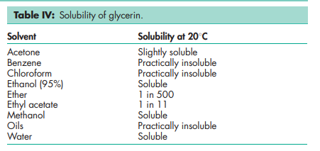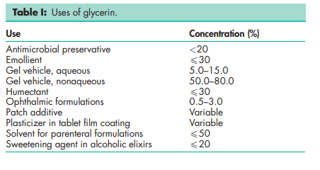 Glycerin is used in a wide variety of pharmaceutical formulations including oral, otic, ophthalmic, topical, and parenteral preparations; see Table I. In topical pharmaceutical formulations and cosmetics, glycerin is used primarily for its humectant and emollient properties. Glycerin is used as a solvent or cosolvent in creams and emulsions.(1–3) Glycerin is additionally used in aqueous and nonaqueous gels and also as an additive in patch applications.(4–6) In parenteral formulations, glycerin is used mainly as a solvent and cosolvent.(7–10) In oral solutions, glycerin is used as a solvent,(10) sweetening agent, antimicrobial preservative, and viscosity-increasing agent. It is also used as a plasticizer and in film coatings.(11–14) Glycerin is used as a plasticizer of gelatin in the production of soft-gelatin capsules and gelatin suppositories. Glycerin is employed as a therapeutic agent in a variety of clinical applications,(15) and is also used as a food additive.
