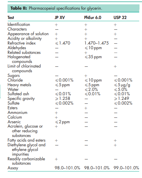 Glycerin is one of the materials that have been selected for harmonization by the Pharmacopeial Discussion Group. For further information see the General Information Chapter <1196> in the USP32–NF27, the General Chapter 5.8 in PhEur 6.0, along with the ‘State of Work’ document on the PhEur EDQM website, and also the General Information Chapter 8 in the JP XV. Some pharmacopeias also contain specifications for diluted glycerin solutions. The JP XV contains a monograph for ‘glycerin’ that contains 84–87% of propane-1,2,3-triol (C3H8O3). The PhEur 6.0 contains a monograph for ‘glycerol 85 per cent’ that contains 83.5–88.5% of propane-1,2,3-triol (C3H8O3). A specification for glycerin is contained in the Food Chemicals Codex (FCC).(21) The EINECS number for glycerin is 200-289-5.