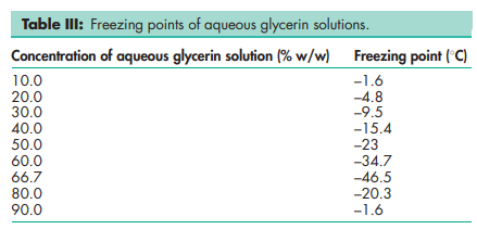 Boiling point 2908C (with decomposition) Density 1.2656 g/cm3 at 158C; 1.2636 g/cm3 at 208C; 1.2620 g/cm3 at 258C. Flash point 1768C (open cup) Freezing point see Table III. Hygroscopicity Hygroscopic. Melting point 17.88C NIR spectra see Figure 1. Osmolarity A 2.6% v/v aqueous solution is isoosmotic with serum. Refractive index n D 15 = 1.4758; n D 20 = 1.4746; n D 25 = 1.4730. Solubility see Table IV. Specific gravity see Table V. Surface tension 63.4 mN/m (63.4 dynes/cm) at 208C. Vapor density (relative) 3.17 (air = 1) Viscosity (dynamic) see Table VI