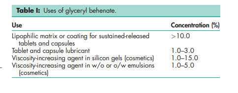Glyceryl behenate is used in cosmetics, foods, and oral pharmaceutical formulations; see Table I. In pharmaceutical formulations, glyceryl behenate is mainly used as a lubricant in the preparation of oral tablets and capsules.(1–3) It has good binding properties, it does not affect tablet hardness and is unaffected by mixing or production parameters. Glyceryl behenate has been investigated for the encapsulation of various drugs such as retinoids.(4) It has also been investigated for use in the preparation of sustained-release tablets;(5–10) as a matrix-forming agent for the controlled release of water-soluble drugs;(10) and it can also be used as a hot-melt coating agent sprayed onto a powder or drug-loaded sugar beads and granules.(11,12) It may also be incorporated via extrusion/spheronization into pellets, which can be further compressed into tablets. Glyceryl behenate is used in oral enteric-coated pellets, powders and suspensions. It is also used in controlled, extended-release and orally disintegrating tablets. For oral preparations, glyceryl behenate forms a lipidic matrix for sustained-release formulations. It has been used along with acid-soluble or swellable polymers to mask the bitter or unpleasant taste of the medicament with improved palatability.(13) Glyceryl behenate has been used for the preparation of ophthalmic inserts.(14,15) In cosmetics, glyceryl behenate is used as a skin conditioning agent, emollient and viscosity-increasing agent in emulsions. It also improves the heat stability of emulsions and is a gelifying agent for various oils. For topical formulations, it is used as a thickening agent for oily phases. It is also used as a surfactant or emulsifying agent