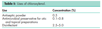 Chloroxylenol is a common constituent of many proprietary disinfectants used for skin and wound disinfection; see Table I. As a pharmaceutical excipient, chloroxylenol is commonly used in low concentrations as an antimicrobial preservative in topical formulations such as creams and ointments. Chloroxylenol is also used in a number of cosmetic formulations. Therapeutically, chloroxylenol has been investigated as a treatment for acne vulgaris,(1,2) for treating infected root canals,(3) and as an antifungal agent when impregnated into medical devices.(4) Chloroxylenol is included in drug products approved for topical antifungal, topical acne and topical dandruff/seborrheic dermatitis/psoriasis treatments.(5)