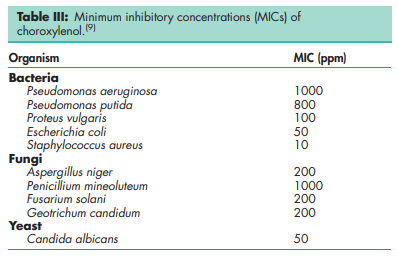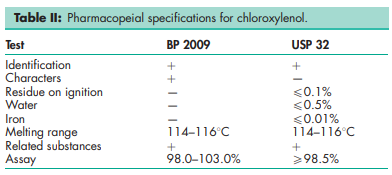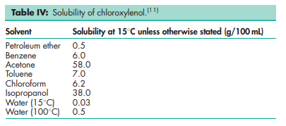 Antimicrobial activity Chloroxylenol is effective against Grampositive bacteria but less active against Gram-negative bacteria. The activity of chloroxylenol against Gram-negative bacilli can be increased by the addition of a chelating agent such as edetic acid.(6) Chloroxylenol is inactive against bacterial spores. Antimicrobial activity may be reduced by loss of chloroxylenol from a formulation due to incompatibilities with packaging materials or other excipients, such as nonionic surfactants.(7) Solution pH does not have a marked effect on the activity of chloroxylenol.(8) For reported minimum inhibitory concentrations (MICs), see Table III. Boiling point 2468C Density 0.89 g/cm3 at 208C(10) Melting point 115.58C Partition coefficient Octanol : water log kow = 3.27(10) Solubility Freely soluble in ethanol (95%); soluble in ether, terpenes, and fixed oils; very slightly soluble in water. Dissolves in solutions of alkali hydroxides. See also Table IV.