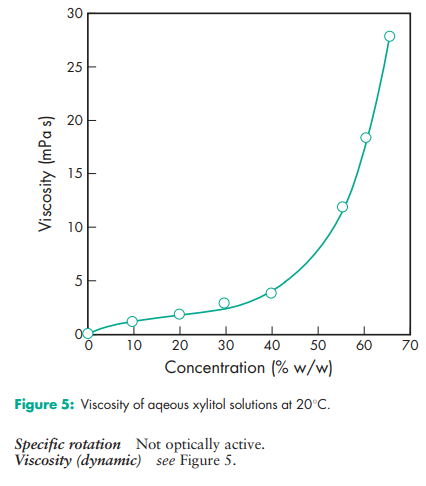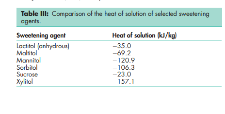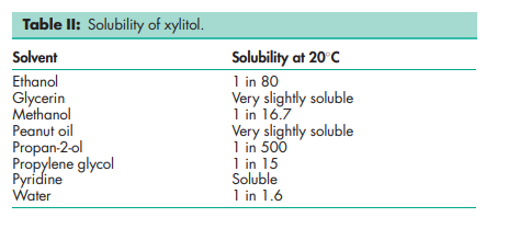 The sweetening power of xylitol is approximately equal to that of sucrose, although it has been shown to be pH-, concentration-, and temperature-dependent; xylitol is approximately 2.5 times as sweet as mannitol. Xylitol is highly chemically stable, meaning that it will not interact with pharmaceutical actives or excipients, and can be utilized over a wide pH range (pH 1–11). Xylitol has a negative heat of solution that is far larger than that of other alternative sweetening agents; see Table III. Because of this, xylitol produces an intense cooling effect as the crystalline material dissolves. Xylitol’s combination of sweetness and cooling can create product appeal while helping to mask the undesirable taste of many pharmaceutical actives or excipients. A specification for xylitol is contained in the Food Chemicals Codex (FCC).(16) The EINECS number for xylitol is 201-788-0. The PubChem Compound ID (CID) for xylitol is 6912.