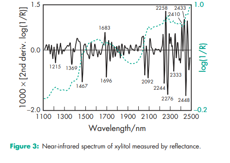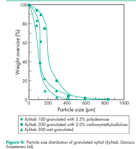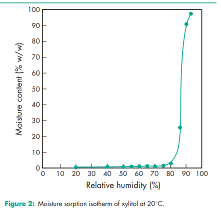 Acidity/alkalinity pH = 5.0–7.0 (10% w/v aqueous solution). Boiling point 215–2178C Compressibility see Figure 1. Crystalline xylitol, under the same test conditions as illustrated in Figure 1, produces 12.5 mm tablets of 40 N hardness at 20 kN compression force. Density (true) 1.52 g/cm3 Density (bulk) 0.8–0.85 g/cm3 for crystalline xylitol; 0.5–0.7 g/cm3 for directly compressible granulated grades Flowability Flow characteristics vary depending upon the particle size of xylitol used. Fine-milled grades tend to be relatively poorly flowing, while granulated grades have good flow properties. Heat of solution 157.1 kJ/kg (–36.7 cal/g) Melting point 92.0–96.08C Moisture content Xylitol is a moderately hygroscopic powder under normal conditions; see also Figure 2. At 208C and 52% relative humidity, the equilibrium moisture content of xylitol is 0.1% w/w. After drying in a vacuum, over P2O5 at 808C for 4 hours, xylitol loses less than 0.5% w/w water. NIR spectra see Figure 3. Osmolarity A 4.56% w/v aqueous solution is iso-osmotic with serum. Particle size distribution The particle size distribution of xylitol depends upon the grade selected. Normal crystalline material typically has a mean particle size of 0.4–0.6 mm. Milled grades are commercially available that offer mean particle sizes as low as 50 mm. Individual suppliers’ literature should be consulted for further information. For particle size distributions of granulated xylitol, see Figure 4. Solubility see Table II