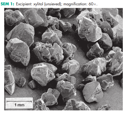 Xylitol is used as a noncariogenic sweetening agent in a variety of pharmaceutical dosage forms, including tablets, syrups, and coatings. It is also widely used as an alternative to sucrose in foods and as a base for medicated confectionery. Xylitol is finding increasing application in chewing gum,(1,2) mouthrinses,(3) and toothpastes(4) as an agent that decreases dental plaque and tooth decay (dental caries). Unlike sucrose, xylitol is not fermented into cariogenic acid end products(5) and it has been shown to reduce dental caries by inhibiting the growth of cariogenic Streptococcus mutans bacteria.(6,7) As xylitol has an equal sweetness intensity to sucrose, combined with a distinct cooling effect upon dissolution of the crystal, it is highly effective in enhancing the flavor of tablets and syrups and masking the unpleasant or bitter flavors associated with some pharmaceutical actives and excipients. In topical cosmetic and toiletry applications, xylitol is used primarily for its humectant and emollient properties, although it has also been reported to enhance product stability through a combination of potentiation of preservatives and its own bacteriostatic and bactericidal properties. Granulates of xylitol are used as diluents in tablet formulations, where they can provide chewable tablets with a desirable sweet taste and cooling sensation, without the ‘chalky’ texture experienced with some other tablet diluents. Xylitol solutions are employed in tablet-coating applications at concentrations in excess of 65% w/w. Xylitol coatings are stable and provide a sweet-tasting and durable hard coating. In liquid preparations, xylitol is used as a sweetening agent and vehicle for sugar-free formulations. In syrups, it has a reduced tendency to ‘cap-lock’ by effectively preventing crystallization around the closures of bottles. Xylitol also has a lower water activity and a higher osmotic pressure than sucrose, therefore enhancing product stability and freshness. In addition, xylitol has also been demonstrated to exert certain specific bacteriostatic and bactericidal effects, particularly against common spoilage organisms.(8,9) Therapeutically, xylitol is additionally utilized as an energy source for intravenous infusion therapy following trauma.(10