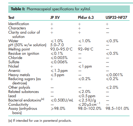 BP: Xylitol JP: Xylitol PhEur: Xylitol USP-NF: Xylitol