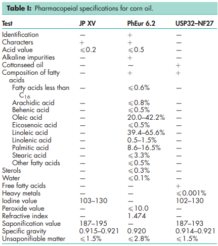 BP: Refined Maize Oil JP: Corn Oil PhEur: Maize Oil, Refined USP-NF: Corn Oil