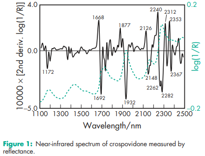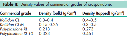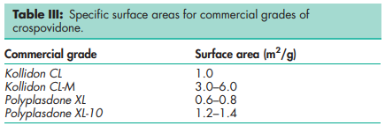 Acidity/alkalinity pH = 5.0–8.0 (1% w/v aqueous slurry) Density 1.22 g/cm3 Density (bulk) see Table II. Density (tapped) see Table II. Moisture content Maximum moisture sorption is approximately 60%. NIR spectra see Figure 1. Particle size distribution Less than 400 mm for Polyplasdone XL; less than 74 mm for Polyplasdone XL-10. Approximately 50% greater than 50 mm and maximum of 3% greater than 250 mm in size for Kollidon CL. Minimum of 90% of particles are below 15 mm for Kollidon CL-M. The average particle size for Crospopharm type A is 100 mm and for Crospopharm type B it is 30 mm. Solubility Practically insoluble in water and most common organic solvents. Specific surface area