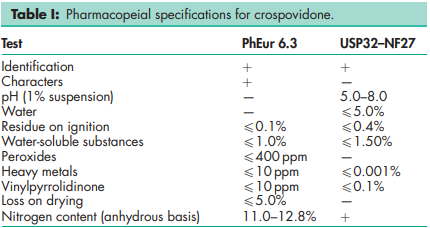 BP: Crospovidone PhEur: Crospovidone USP-NF: Crospovidone