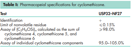 The USP32–NF27 describes cyclomethicone as a fully methylated cyclic siloxane containing repeating units of the formula [– (CH3)2SiO–]n in which n is 4, 5, or 6, or a mixture of them