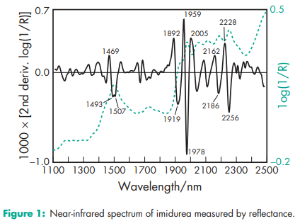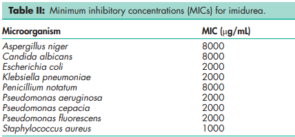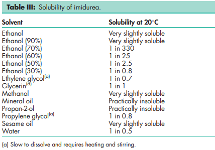 Acidity/alkalinity pH = 6.0–7.5 (1% w/v aqueous solution) Antimicrobial activity Predominantly an antibacterial preservative, imidurea also has some selective antifungal properties. Used at concentrations between 0.03–0.5% w/w it is effective between pH 3–9, although preservative efficacy is best seen in slightly acidic solutions. Synergistic effects have been reported, and preservative activity is considerably enhanced, particularly against fungi, when used in combination with parabens.(1,2) A cosmetic formulation containing 0.5% imidurea, 0.2% methylparaben, and 0.1% propylparaben was effectively preserved against various Pseudomonas species.(3) For reported minimum inhibitory concentrations (MICs), see Table II.(4) NIR spectra see Figure 1. Solubility Soluble in water and in glycerol, but insoluble in almost all organic solvents.(4)