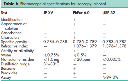 BP: Isopropyl Alcohol JP: Isopropanol PhEur: Isopropyl Alcohol USP: Isopropyl Alcohol