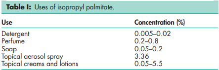 Isopropyl palmitate is a nongreasy emollient with good spreading characteristics, used in topical pharmaceutical formulations and cosmetics such as: bath oils; creams; lotions; make-up; hair care products; deodorants; lip products; suntan preparations; and pressed powders; see Table I. Isopropyl palmitate is an established penetration enhancer for transdermal systems. It has also been used in controlled-release percutaneous film