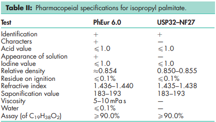 BP: Isopropyl Palmitate PhEur: Isopropyl Palmitate USP-NF: Isopropyl Palmitate