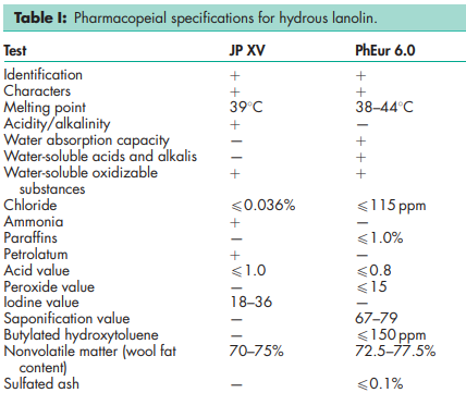 The JP XV describes hydrous lanolin as a mixture of lanolin and 25–30% w/w purified water. The PhEur 6.0 describes hydrous lanolin as a mixture of lanolin and 25% w/w purified water; see also Section 18. The PhEur 6.0 additionally permits the inclusion of up to 150 ppm of butylated hydroxytoluene as an antioxidant