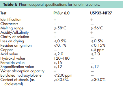 Lanolin alcohols is a crude mixture of steroidal and triterpene alcohols, including not less than 30% cholesterol, and 10–13% isocholesterol. The USP32–NF27 permits the inclusion of up to 0.1% w/w of a suitable antioxidant, while the PhEur 6.0 specifies that lanolin alcohols may contain up to 200 ppm of butylated hydroxytoluene as an antioxidant.
