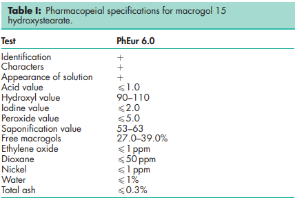 BP: Macrogol 15 Hydroxystearate PhEur: Macrogol 15 Hydroxystearate