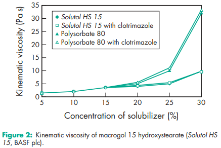 Macrogol 15 hydroxystearate is frequently used in preclinical testing of drugs, mainly for IV and other parenteral applications.(1–4) The solubilizing capacity for some tested drugs (clotrimazole, carbamazepine, 17b-estradiol, sulfathiazole, and piroxicam) increases almost linearly with increasing concentration of solubilizing agent; see Figure 1. This is due to the formation of spherical micelles even at high concentrations of macrogol 15 hydroxystearate. Similarly, tests have revealed that viscosity increases with increasing amount of solubilizer, but the amount of solubilized drugs does not have any additional influence on the kinematic viscosity; see Figure 2. Lipid nanocapsules comprising macrogol 15 hydroxystearate and soybean phosphatidylcholine containing 3% docetaxel have been successfully prepared by a solvent-free inversion process. Macrogol 15 hydroxystearate has been used in the manufacture of aqueous parenteral preparations with vitamin A, D, E and K, and a number of other lipophilic pharmaceutical active agents, such as propanidid, miconazole, alfadolone, and alfaxalone. It is very efficient at solubilizing substances like fat-soluble vitamins and active ingredients of hydrophobic nature. It is also an excellent solubilizer for parenteral use, at a concentration of 20%, and the water solubility of different drugs may be enhanced by a factor of 10–100, depending on the structure of the drug molecule.