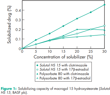 Macrogol 15 hydroxystearate is not restricted solely to parenteral use, but is also suitable for oral applications. Macrogol 15 hydroxystearate has been investigated as a coemulsifier in the preparation of parenteral o/w emulsions(2) and microemulsions.(6–8) It has also been investigated as a weak inhibitor of cytochrome P450 3A activity on the metabolism of colchicine and midazolum.(9–11) Oral bioavailability of the highly lipophilic and poorly watersoluble immunosuppressive agent, ciclosporin A, showed twofold higher bioavailability with a macrogol 15 hydroxystearate-based formulation compared to a microsuspension.(12) It has also been studied along with microcrystalline cellulose to prepare selfemulsifying pellets using an extrusion/spheronization technique to increase the bioavailability of lipophilic drugs.(13) Macrogol 15 hydroxystearate has been incorporated as a solubility-increasing additive in rectal suppository dosage form to study the increase in bioavailability of poorly water-soluble drugs.(14) Macrogol 15 hydroxystearate has been investigated as a therapeutic agent in the preparation of lipid nanoparticles of an anticancer drug,(15) and has also been shown to be effective for reversing multidrug resistance, with low toxicity in vivo. (16) The PubChem Compound ID (CID) for Solutol HS 15 is 124898.