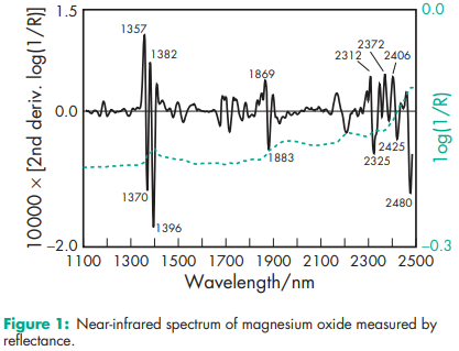 Acidity/alkalinity pH = 10.3 (saturated aqueous solution) Boiling point 36008C Melting point 28008C NIR spectra see Figure 1. Particle size distribution 99.98% less than 45 mm in size (light magnesium oxide). Refractive index 1.735 Solubility Soluble in dilute acids and ammonium salt solutions; very slightly soluble in pure water (0.0086 g/100 mL at 308C; solubility is increased by carbon dioxide); practically insoluble in ethanol (95%). Specific gravity 3.58 g/cm3 at 258C (heavy magnesium oxide).