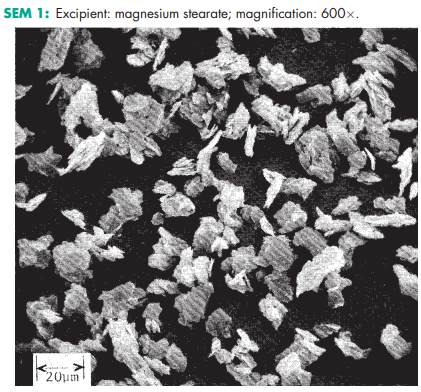 Magnesium stearate is one of the materials that have been selected for harmonization by the Pharmacopeial Discussion Group. For further information see the General Information Chapter <1196> in the USP32–NF27, the General Chapter 5.8 in PhEur 6.0, along with the ‘State of Work’ document on the PhEur EDQM website, and also the General Information Chapter 8 in the JP XV. Magnesium stearate is hydrophobic and may retard the dissolution of a drug from a solid dosage form; the lowest possible concentration is therefore used in such formulations.(5–10) Capsule dissolution is also sensitive to both the amount of magnesium stearate in the formulation and the mixing time; higher levels of magnesium stearate and long mixing times can result in the formation of hydrophobic powder beds that do not disperse after the capsule shell dissolves.(11,12) An increase in the coefficient of variation of mixing and a decrease in the dissolution rate have been observed following blending of magnesium stearate with a tablet granulation. Tablet dissolution rate and crushing strength decreased as the time of blending increased; and magnesium stearate may also increase tablet friability. Blending times with magnesium stearate should therefore be carefully controlled.(13–29) A variety of online analytical techniques have been investigated to monitor magnesium stearate in powder blends and tablets.(30–32) Inverse gas chromatography has been used to examine the surface coverage of magnesium stearate on powder blends.(33) Magnesium stearate also affects the flow properties of blends.(34) The existence of various crystalline forms of magnesium stearate has been established.(35–39) A trihydrate, a dihydrate, and an anhydrate have been isolated,(5,37,38,40) and an amorphous form has been observed.(41) While the hydrated forms are stable in the presence of moisture, the anhydrous form adsorbs moisture at relative humidity up to 50%, and at higher humidities rehydrates to form the trihydrate. The anhydrate can be formed by drying either of the hydrates at 1058C.(38) It has not been conclusively established which form of pure magnesium stearate possesses the best lubricating properties.(36,37,41–43) Commercial lots of magnesium stearate generallyconsist of mixtures of crystalline forms.(37,39,41,42,44–46) Because of the possibility of conversion of crystalline forms during heating, consideration should be given to the pretreatment conditions employed when determining physical properties of magnesium stearate powders such as surface area.(47,48) Physical properties of magnesium stearate can vary among batches from different manufacturers(46) because the solid-state characteristics of the powder are influenced by manufacturing variables.(36) Variations in the physical properties of different lots of magnesium stearate from the same vendor have also been observed.(46) Presumably because of these variations, it has not been possible to conclusively correlate the dissolution rate retardation with observed lubricity.(49) However, various physical properties of different batches of magnesium stearate, such as specific surface area, particle size, crystalline structure, moisture content, and fatty acid composition, have been correlated with lubricant efficacy.(37,41,45,46,50–55) Due to variations in the specific surface area, the labeling states that specific surface area and the method specified for its determination should be listed on the label. Reduction in dissolution caused by the effects of magnesium stearate in some cases can be overcome by including a highly swelling disintegrant in the formulation.(56) The impact of magnesium stearate levels on tablet compaction properties and performance of roller compacted granulations has been examined.(57–59) In other compaction studies performed with granules, magnesium stearate has been shown to exert an influence on granule relaxation and may help to prevent capping.(60) There is evidence to suggest that the hydrophobic nature of magnesium stearate can vary from batch to batch owing to the presence of water-soluble, surface-active impurities such as sodium stearate. Batches containing very low concentrations of these impurities have been shown to retard the dissolution of a drug to a greater extent than when using batches that contain higher levels of impurities.(49) One study related lubricity to the fatty acid composition (stearate : palmitate) of lubricant lots for tablet formulations based on compaction data and tablet material properties.(54) However, other studies have indicated that fatty acid composition has no influence on lubricant activity(37) and highpurity magnesium stearate was as effective a lubricant as the commercial material.(10) Moisture sorption at different relative humidities can result in morphological changes in the magnesium stearate.(61,62) Magnesium stearate has been investigated for use in inhalation powders to control their performance.(63) A specification for magnesium stearate is included in the Food Chemicals Codex (FCC).(64) The EINECS number for magnesium stearate is 209-150-3.