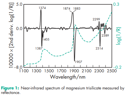 Moisture content Magnesium trisilicate is slightly hygroscopic. At relative humidities of 15–65%, the equilibrium moisture content at 258C is 17–23% w/w; at relative humidities of 75–95%, the equilibrium moisture content is 24–30% w/w. NIR spectra see Figure 1. Solubility Practically insoluble in diethyl ether, ethanol (95%) and water.