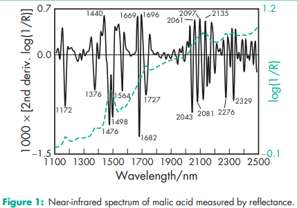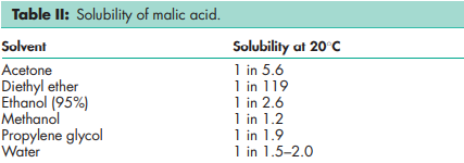 Data shown below are for the racemate. See Section 17 for other data for the D and L forms. Acidity/alkalinity pH = 2.35 (1% w/v aqueous solution at 258C) Boiling point 1508C (with decomposition) Density (bulk) 0.81 g/cm3 Density (tapped) 0.92 g/cm3 Dissociation constant pKa1 = 3.40 at 258C; pKa2 = 5.05 at 258C. Melting point 131–1328C NIR spectra see Figure 1. Solubility Freely soluble in ethanol (95%) and water but practically insoluble in benzene. A saturated aqueous solution contains about 56% malic acid at 208C. See Table II. Specific gravity 1.601 at 208C; 1.250 (saturated aqueous solution at 258C). Viscosity (dynamic) 6.5 mPa s (6.5 cP) for a 50% w/v aqueous solution at 258C