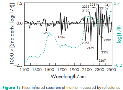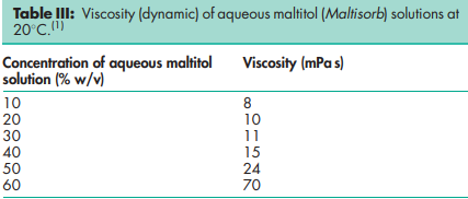 Compressibility 9.5% Density (bulk) 0.79 g/cm3 (1) Density (crystal) 1.6238 (calculated from crystallographic data).(2) Density (tapped) 0.95 g/cm3 (1) Flowability 5 seconds(1) Melting point 148–1518C NIR spectra see Figure 1. Particle size distribution 95% 4 500 mm, 40% 5 100 mm in size for Maltisorb P200 (Roquette); 95% 4 200 mm, 50% 5 100 mm in size for Maltisorb P90 (Roquette). Solubility Freely soluble in water. See also Table II. Viscosity (dynamic)