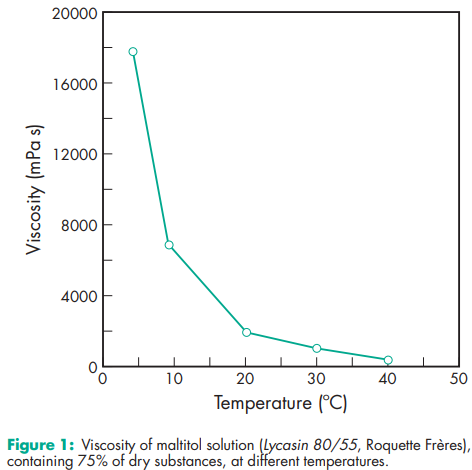 Boiling point 1058C Flash point >1508C Density 1.36 g/cm3 at 208C Heat of combustion 10.0 kJ/g (2.4 kcal/g) Osmolarity The osmolarity of an aqueous maltitol solution is similar to that of a sucrose solution of the same concentration. A 10% v/v aqueous solution of Lycasin 80/55 (Roquette) is isoosmotic with serum. Refractive index nD 20 = 1.478 Solubility Miscible with ethanol (provided the ethanol concentration is less than 55%), glycerin, propylene glycol, and water. Insoluble in mineral and vegetable oils. Viscosity (dynamic) Maltitol solution is a viscous, syrupy, liquid. At 208C, a solution of Lycasin 80/55 (Roquette) containing 75% of dry substances has a viscosity of approximately 2000 mPa s (2000 cP). With increasing temperature, the viscosity of a maltitol solution is reduced; see Figure 1. The viscosity of maltitol solutions also decreases with decreasing concentration of dry solids, at a constant temperature. Maltitol solution may also be mixed with sorbitol solution to obtain blends of a desired viscosity