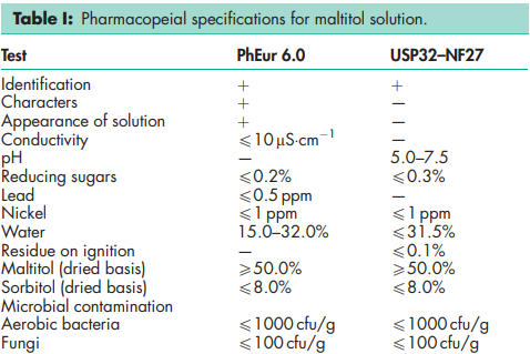 The PhEur 6.0 describes liquid maltitol as an aqueous solution of a hydrogenated, partly hydrolyzed starch, with not less than 68% w/w of solid matter and not more than 85% w/w. This is composed of a mixture of mainly D-maltitol (550% w/w), D-sorbitol (48% w/w), and hydrogenated oligo- and polysaccharides, all quoted on an anhydrous basis. The USP32–NF27 describes maltitol solution as a water solution containing, on the anhydrous basis, not less than 50% w/w of Dmaltitol (C12H24O11) and not more than 8.0% w/w of D-sorbitol (C6H14O6