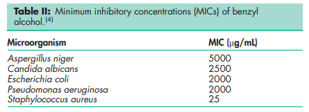 Benzyl alcohol is an antimicrobial preservative used in cosmetics, foods, and a wide range of pharmaceutical formulations,(1–4) including oral and parenteral preparations, at concentrations up to 2.0% v/v. The typical concentration used is 1% v/v, and it has been reported to be used in protein, peptide and small molecule products, although its frequency of use has fallen from 48 products in 1996, 30 products in 2001, to 15 products in 2006.(5) In cosmetics, concentrations up to 3.0% v/v may be used as a preservative. Concentrations of 5% v/v or more are employed as a solubilizer, while a 10% v/v solution is used as a disinfectant. Benzyl alcohol 10% v/v solutions also have some local anesthetic properties, which are exploited in some parenterals, cough products, ophthalmic solutions, ointments, and dermatological aerosol sprays. Although widely used as an antimicrobial preservative, benzyl alcohol has been associated with some fatal adverse reactions when administered to neonates. It is now recommended that parenteral products preserved with benzyl alcohol, or other antimicrobial preservatives, should not be used in newborn infants if at all possible; see Section 14.