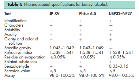 BP: Benzyl Alcohol JP: Benzyl Alcohol PhEur: Benzyl Alcohol USP-NF: Benzyl Alcohol