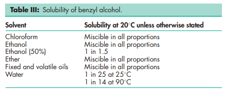 Acidity/alkalinity Aqueous solutions are neutral to litmus. Antimicrobial activity Benzyl alcohol is bacteriostatic and is used as an antimicrobial preservative against Gram-positive bacteria, molds, fungi, and yeasts, although it possesses only modest bactericidal properties. Optimum activity occurs at pH below 5; little activity is shown above pH 8. Antimicrobial activity is reduced in the presence of nonionic surfactants, such as polysorbate 80. However, the reduction in activity is less than is the case with either hydroxybenzoate esters or quaternary ammonium compounds. The activity of benzyl alcohol may also be reduced by incompatibilities with some packaging materials, particularly polyethylene; see Section 12. See Table II for reported minimum inhibitory concentrations (MICs). Bacteria Benzyl alcohol is moderately active against most Gram-positive organisms (typical MICs are 3–5 mg/mL), although some Gram-positive bacteria are very sensitive (MICs 0.025–0.05 mg/mL). In general, benzyl alcohol is less active against Gram-negative organisms. Fungi Benzyl alcohol is effective against molds and yeasts; typical MICs are 3–5 mg/mL. Spores Benzyl alcohol is inactive against spores, but activity may be enhanced by heating. Benzyl alcohol 1% v/v, at pH 5–6, has been claimed to be as effective as phenylmercuric nitrate 0.002% w/v against Bacillus stearothermophilus at 1008C for 30 min. Autoignition temperature 436.58C Boiling point 204.78C Flammability Flammable. Limits in air 1.7–15.0% v/v. Flash point 100.68C (closed cup); 104.58C (open cup). Freezing point 158C Partition coefficients Liquid paraffin : water = 0.2; Octanol : water = 1.10; Peanut oil : water = 1.3. Solubility see Table III.