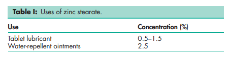 Zinc stearate is primarily used in pharmaceutical formulations as a lubricant in tablet and capsule manufacture at concentrations up to 1.5% w/w. It has also been used as a thickening and opacifying agent in cosmetic and pharmaceutical creams, and as a dusting powder. See Table I.