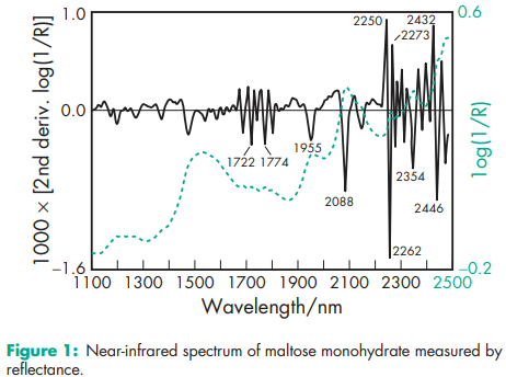 Acidity/alkalinity pH = 4.5–6.5 for a 10% w/v aqueous solution. Angle of repose 37.18 for Advantose 100. (3) Density (bulk) 0.67–0.72 g/cm3 for Advantose 100. (1) Density (tapped) 0.73–0.81 g/cm3 for Advantose 100. (1) Dissociation constant pKa = 12.05 at 218C Flash point >1498C for Advantose 100. (1) Flowability 18% (Carr compressibility index) for Advantose 100. (3) Melting point 120–1258C.(4) NIR spectra see Figure 1. Particle size distribution 15–20% greater than 300 mm, and 70–75% greater than 150 mm in size for Advantose 100. (1) Specific surface area 0.08 m2 /g for Advantose 100.(1) Solubility Very soluble in water; very slightly soluble in cold ethanol (95%); practically insoluble in ether.