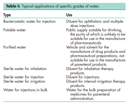 Water is widely used as a raw material, ingredient and solvent in the processing, formulation and manufacture of pharmaceutical products, active pharmaceutical ingredients (API) and intermediates, and analytical reagents. Specific grades of water are used for particular applications in concentrations up to 100%; see Table I.