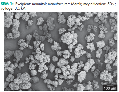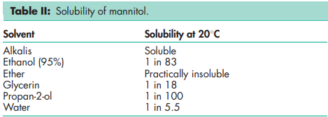 Mannitol is widely used in pharmaceutical formulations and food products. In pharmaceutical preparations it is primarily used as a diluent (10–90% w/w) in tablet formulations, where it is of particular value since it is not hygroscopic and may thus be used with moisture-sensitive active ingredients.(1,2) Mannitol may be used in direct-compression tablet applications,(3,4) for which the granular and spray-dried forms are available, or in wet granulations.(5,6) Granulations containing mannitol have the advantage of being dried easily. Specific tablet applications include antacid preparations, glyceryl trinitrate tablets, and vitamin preparations. Mannitol is commonly used as an excipient in the manufacture of chewable tablet formulations because of its negative heat of solution, sweetness, and ‘mouth feel’. (6,7) In lyophilized preparations, mannitol (20–90% w/w) has been included as a carrier to produce a stiff, homogeneous cake that improves the appearance of the lyophilized plug in a vial.(8–10) A pyrogen-free form is available specifically for this use. Mannitol has also been used to prevent thickening in aqueous antacid suspensions of aluminum hydroxide (<7% w/v). It has been suggested as a plasticizer in soft-gelatin capsules, as a component of sustained-release tablet formulations,(11) and as a carrier in dry powder inhalers.(12,13) It is also used as a diluent in rapidly dispersing oral dosage forms.(14,15) It is used in food applications as a bulking agent. Therapeutically, mannitol administered parenterally is used as an osmotic diuretic, as a diagnostic agent for kidney function, as an adjunct in the treatment of acute renal failure, and as an agent to reduce intracranial pressure, treat cerebral edema, and reduce intraocular pressure. Given orally, mannitol is not absorbed significantly from the gastrointestinal tract, but in large doses it can cause osmotic diarrhea