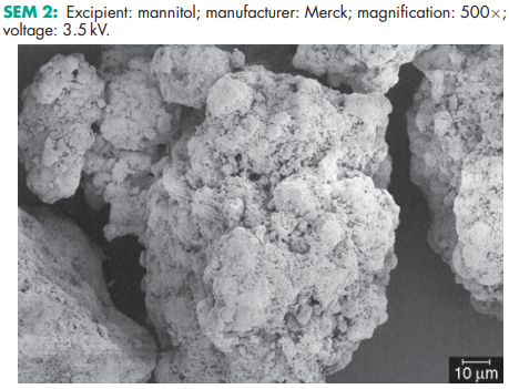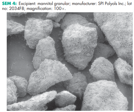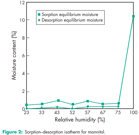 Mannitol is one of the materials that have been selected for harmonization by the Pharmacopeial Discussion Group. For further information see the General Information Chapter <1196> in the USP32–NF27, the General Chapter 5.8 in PhEur 6.0, along with the ‘State of Work’ document on the PhEur EDQM website, and also the General Information Chapter 8 in the JP XV. Mannitol is an isomer of sorbitol, the difference between the two polyols occurring in the planar orientation of the OH group on the second carbon atom. Each isomer is characterized by its own individual set of properties, the most important difference being the response to moisture. Sorbitol is hygroscopic, while mannitol resists moisture sorption, even at high relative humidities. Granular mannitol flows well and imparts improved flow properties to other materials. However, it usually cannot be used with concentrations of other materials exceeding 25% by weight. Recommended levels of lubricant are 1% w/w calcium stearate or 1–2% w/w magnesium stearate. Suitable binders for preparing granulations of powdered mannitol are gelatin, methylcellulose 400, starch paste, povidone, and sorbitol. Usually, 3–6 times as much magnesium stearate or 1.5–3 times as much calcium stearate is needed for lubrication of mannitol granulations than is needed for other excipients. A study has examined the influence of common excipients such as sucrose and trehalose, on the crystallization of mannitol in freezedrying.(28) Mannitol has been reported to sublime at 1308C.(29) Ludiflash (BASF) is a coprocessed excipient used as a tablet filler, binder, and disintegrant, and contains mainly mannitol, and also crospovidone and polyvinyl acetate. A specification for mannitol is contained in the Food Chemicals Codex (FCC).(30) The EINECS number for mannitol is 200-711-8. The PubChem Compound ID (CID) for mannitol includes 6251 and 453.