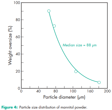 Compressibility see Figure 1. Density (bulk) 0.430 g/cm3 for powder; 0.7 g/cm3 for granules. Density (tapped) 0.734 g/cm3 for powder; 0.8 g/cm3 for granules. Density (true) 1.514 g/cm3 Dissociation constant pKa = 13.5 at 188C Flash point <1508C Flowability Powder is cohesive, granules are free flowing. Heat of combustion 16.57 kJ/g (3.96 kcal/g) Heat of solution 120.9 J/g (28.9 cal/g) at 258C Melting point 166–1688C Moisture content see Figure 2. NIR spectra see Figure 3. Osmolarity A 5.07% w/v aqueous solution is isoosmotic with serum. Particle size distribution Pearlitol 300 DC: maximum of 0.1% greater than 500 mm and minimum of 90% greater than 200 mm in size; Pearlitol 400 DC: maximum of 20% greater than 500 mm and minimum of 85% greater than 100 mm in size; Pearlitol 500 DC: maximum of 0.5% greater than 841 mm and minimum of 90% greater than 150 mm in size. Average particle diameter is 250 mm for Pearlitol 300 DC, 360 mm for Pearlitol 400 DC and 520 mm for Pearlitol 500 DC. (17) See also Figure 4. Refractive index nD 20 = 1.333 Solubility see Table II. Specific surface area 0.37–0.39 m2 /g