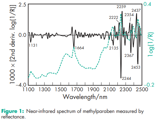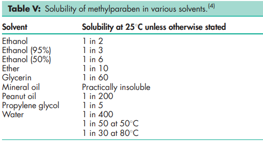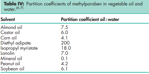 Antimicrobial activity see Table III. Methylparaben exhibits antimicrobial activity of pH 4–8. Preservative efficacy decreases with increasing pH owing to the formation of the phenolate anion. Parabens are more active against yeasts and molds than against bacteria. They are also more active against Grampositive bacteria than against Gram-negative bacteria. Methylparaben is the least active of the parabens; antimicrobial activity increases with increasing chain length of the alkyl moiety. Activity may be improved by using combinations of parabens as synergistic effects occur. Therefore, combinations of methyl-, ethyl-, propyl-, and butylparaben are often used together. Activity has also been reported to be enhanced by the addition of other excipients such as: propylene glycol (2–5%);(2) phenylethyl alcohol;(3) and edetic acid.(4) Activity may also be enhanced owing to synergistic effects by using combinations of parabens with other antimicrobial preservatives such as imidurea.(5) The hydrolysis product p-hydroxybenzoic acid has practically no antimicrobial activity Density (true) 1.352 g/cm3 Dissociation constant pKa = 8.4 at 228C Melting point 125–1288C NIR spectra see Figure 1. Partition coefficients Values for different vegetable oils vary considerably and are affected by the purity of the oil; see Table IV. Solubility
