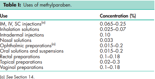 Methylparaben and other parabens are widely used as antimicrobial preservatives in cosmetics and oral and topical pharmaceutical formulations. Although parabens have also been used as preservatives in injections and ophthalmic preparations, they are now generally regarded as being unsuitable for these types of formulations owing to the irritant potential of the parabens. These experiences may depend on immune responses to enzymatically formed metabolites of the parabens in the skin. Parabens are nonmutagenic, nonteratogenic, and noncarcinogenic. Sensitization to the parabens is rare, and these compounds do not exhibit significant levels of photocontact sensitization or phototoxicity. Hypersensitivity reactions to parabens, generally of the delayed type and appearing as contact dermatitis, have been reported. However, given the widespread use of parabens as preservatives, such reactions are relatively uncommon; the classification of parabens in some sources as high-rate sensitizers may be overstated.(22) Immediate hypersensitivity reactions following injection of preparations containing parabens have also been reported.(23–25) Delayed-contact dermatitis occurs more frequently when parabens are used topically, but has also been reported to occur after oral administration.(26–28) Unexpectedly, preparations containing parabens may be used by patients who have reacted previously with contact dermatitis provided they are applied to another, unaffected, site. This has been termed the paraben paradox.(29) Concern has been expressed over the use of methylparaben in infant parenteral products because bilirubin binding may be affected, which is potentially hazardous in hyperbilirubinemic neonates.(30) The WHO has set an estimated total acceptable daily intake for methyl-, ethyl-, and propylparabens at up to 10 mg/kg bodyweight.(31) LD50 (dog, oral): 3.0 g/kg(32) LD50 (mouse, IP): 0.96 g/kg LD50 (mouse, SC): 1.20 g/kg