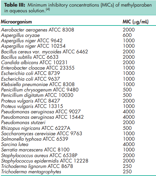 Methylparaben is widely used as an antimicrobial preservative in cosmetics, food products, and pharmaceutical formulations; see Table I. It may be used either alone or in combination with other parabens or with other antimicrobial agents. In cosmetics, methylparaben is the most frequently used antimicrobial preservative.(1) The parabens are effective over a wide pH range and have a broad spectrum of antimicrobial activity, although they are most effective against yeasts and molds. Antimicrobial activity increases as the chain length of the alkyl moiety is increased, but aqueous solubility decreases; therefore a mixture of parabens is frequently used to provide effective preservation. Preservative efficacy is also improved by the addition of propylene glycol (2–5%), or by using parabens in combination with other antimicrobial agents such as imidurea; see Section 10. Owing to the poor solubility of the parabens, paraben salts (particularly the sodium salt) are more frequently used in formulations. However, this raises the pH of poorly buffered formulations. Methylparaben (0.18%) together with propylparaben (0.02%) has been used for the preservation of various parenteral pharmaceutical formulations; z
