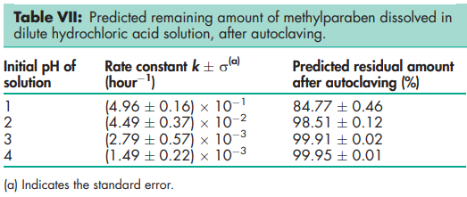 Aqueous solutions of methylparaben at pH 3–6 may be sterilized by autoclaving at 1208C for 20 minutes, without decomposition.(8) Aqueous solutions at pH 3–6 are stable (less than 10% decomposition) for up to about 4 years at room temperature, while aqueous solutions at pH 8 or above are subject to rapid hydrolysis (10% or more after about 60 days storage at room temperature) Methylparaben should be stored in a well-closed container in a cool, dry place.