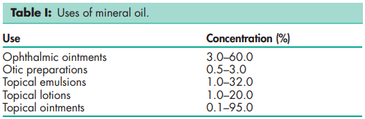 Mineral oil is used primarily as an excipient in topical pharmaceutical formulations, where its emollient properties are exploited as an ingredient in ointment bases; see Table I. It is additionally used in oil-in-water emulsions,(1–5) as a solvent, and as a lubricant in capsule and tablet formulations, and to a limited extent as a mold-release agent for cocoa butter suppositories. It has also been used in the preparation of microspheres and as a vaccine adjunct.(6–10) Therapeutically, mineral oil has been used as a laxative, see Section 14. It is indigestible and thus has limited absorption. Mineral oil is used in ophthalmic formulations for its lubricant properties. It is also used in cosmetics and some food products.(11