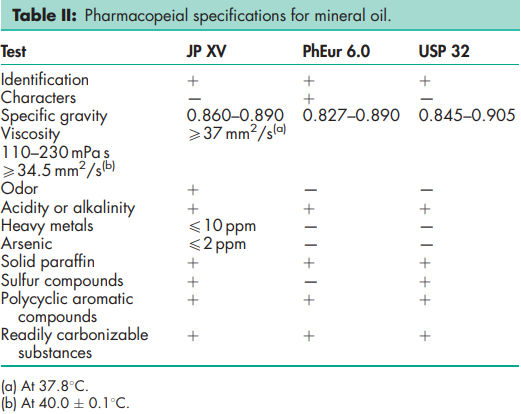 BP: Liquid Paraffin JP: Liquid Paraffin PhEur: Paraffin, Liquid USP: Mineral Oil