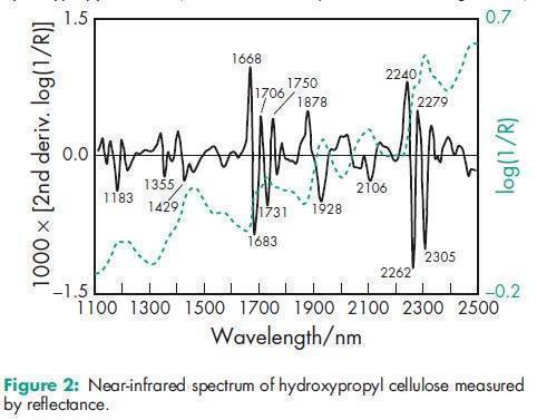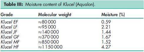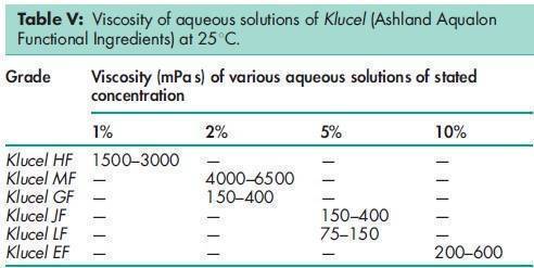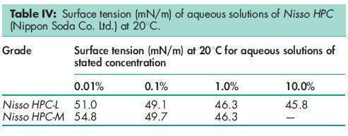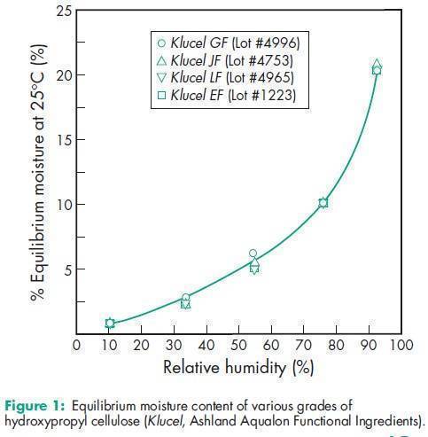 Acidity/alkalinity pH = 5.0–8.5 for a 1% w/w aqueous solution (as stated in PhEur 6.0). Density (bulk) 0.5 g/cm3 Interfacial tension 12.5mN/m for a 0.1% w/w aqueous solution compared with mineral oil. Melting point Softens at 1308C; chars at 260–2758C. Moisture content Hydroxypropyl cellulose absorbs moisture from the atmosphere; the amount of water absorbed depends upon the initial moisture content and the temperature and relative humidity of the surrounding air. Typical equilibrium moisture content values at 258C are 4% w/w at 50% relative humidity and 12% w/w at 84% relative humidity. See Table III. See also Figure 1. NIR spectra see Figure 2. Particle size distribution Klucel (regular grind), minimum 85% (minimun 80% for Klucel H grades) through a US #30 mesh (590 mm), and minimum 99% through a US #20 mesh (840 mm); Klucel (fine-grind), minimum 99% through a US #60 mesh (250 mm), minimum 90% through a US #80 mesh (177 mm), and minimum 80% through a US #100 mesh (149 mm); Nisso HPC-L (regular type): 99% through a US #40 mesh sieve (350 mm); Nisso HPC-L (fine powder type): 99% through a US #100 mesh sieve (150 mm). Refractive index n D 20 = 1.3353 for a 2% w/v aqueous solution. Solubility Soluble 1 in 10 parts dichloromethane; 1 in 2.5 parts ethanol (95%); 1 in 2 parts methanol; 1 in 5 parts propan-2-ol; 1 in 5 parts propylene glycol; and 1 in 2 parts water. Practically insoluble in aliphatic hydrocarbons; aromatic hydrocarbons; carbon tetrachloride; petroleum distillates; glycerin; and oils. Hydroxypropyl cellulose is freely soluble in water below 388C, forming a smooth, clear, colloidal solution. In hot water, it is insoluble and is precipitated as a highly swollen floc at a temperature between 40 and 458C. Hydroxypropyl cellulose is soluble in many cold or hot polar organic solvents such as dimethyl formamide; dimethyl sulfoxide; dioxane; ethanol (95%); methanol; propan-2-ol (95%); and propylene glycol. There is no tendency for precipitation in hot organic solvents. However, the grade of hydroxypropyl cellulose can have a marked effect upon solution quality in some organic liquids that are borderline solvents, such as acetone; butyl acetate; cyclohexanol; dichloromethane; lactic acid; methyl acetate; methyl ethyl ketone; propan-2-ol (99%); and tert-butanol. The higher-viscosity grades of hydroxypropyl cellulose tend to produce slightly inferior solutions. However, the solution quality in borderline solvents can often be greatly improved by the use of small quantities (5–15%) of a cosolvent. For example, dichloromethane is a borderline solvent for Klucel HF and solutions have a granular texture, but a smooth solution may be produced by adding 10% methanol. Hydroxypropyl cellulose is compatible with a number of high-molecular weight, high-boiling waxes and oils, and can be used to modify certain properties of these materials. Examples of materials that are good solvents for hydroxypropyl cellulose at an elevated temperature are acetylated monoglycerides, glycerides, pine oil, polyethylene glycol, and polypropylene glycol. Specific gravity 1.2224 for particles; 1.0064 for a 2% w/v aqueous solution at 208C. Surface tension see Table IV. Viscosity (dynamic) A wide range of viscosity types are commercially available; see Table V. Solutions should be prepared by gradually adding the hydroxypropyl cellulose to a vigorously stirred solvent. Increasing concentration produces solutions of increased viscosity. See also Section 11 for information on solution stability.
