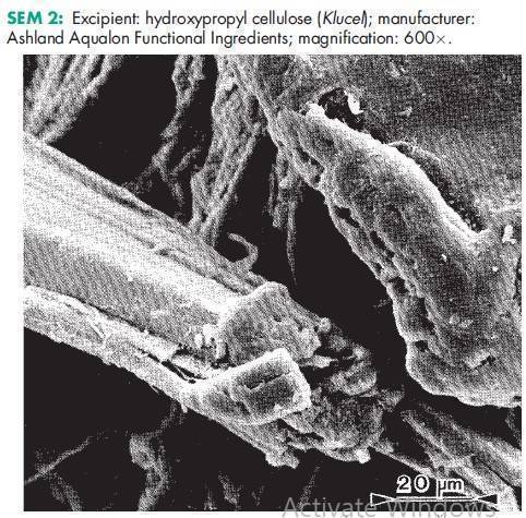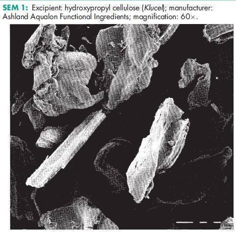 Hydroxypropyl cellulose is widely used in oral and topical pharmaceutical formulations; see Table I. In oral products, hydroxypropyl cellulose is primarily used in tableting as a binder,(1) film-coating,(2) and extended-release-matrix former.(3–5) Concentrations of hydroxypropyl cellulose of 2–6% w/w may be used as a binder in either wet-granulation or dry, directcompression tableting processes.(6–10) Concentrations of 15–35% w/w of hydroxypropyl cellulose may be used to produce tablets with an extended drug release.(11) The release rate of a drug increases with decreasing viscosity of hydroxypropyl cellulose. The addition of an anionic surfactant similarly increases the viscosity of hydroxypropyl cellulose and hence decreases the release rate of a drug. Blends of hydroxypropyl cellulose and other cellulosic polymers have been used to improve wet granulation characteristics and tableting characteristics, as well as to achieve better control and manipulation of the rate of drug release.(12–15) As an alternative technology to wet granulation, dry granulation and direct compression of hydroxypropyl cellulose formulations have been reported to exhibit acceptable tableting and flow characteristics for application in extended-release matrix tablets.(16,17) Typically, a 5% w/w solution of hydroxypropyl cellulose may be used to film-coat tablets. Aqueous solutions containing hydroxypropyl cellulose together with an amount of methyl cellulose or ethanolic solutions have been used.(18–20) Stearic acid or palmitic acid may be added to ethanolic hydroxypropyl cellulose solutions as plasticizers. Environmental concerns have limited the use of ethanol in film coating solutions. A low-substituted hydroxypropyl cellulose is used as a tablet disintegrant; see Hydroxypropyl Cellulose, Low-substituted. Hydroxypropyl cellulose is also used in microencapsulation processes and as a thickening agent. In topical formulations, hydroxypropyl cellulose is used in transdermal patches and ophthalmic preparations.(21–23) Hydroxypropyl cellulose is also used in cosmetics and in food products as an emulsifier and stabilizer.