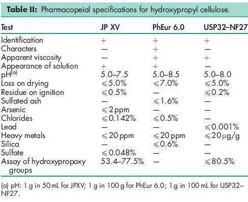 BP: Hydroxypropylcellulose JP: Hydroxypropylcellulose PhEur: Hydroxypropylcellulose USP-NF: Hydroxypropyl Cellulose